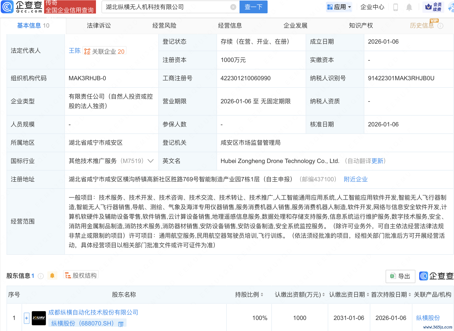近日,湖北纵横无人机科技有限公司成立,注册资本1000万元,经营范围包含:人工智能通用应用系统;人工智能应用软件开发;智能无人飞行器制造;通用航空服务;民用航空器驾驶员培训等。企查查股权穿透显示,该公司由纵横股份(688070)全资持股。